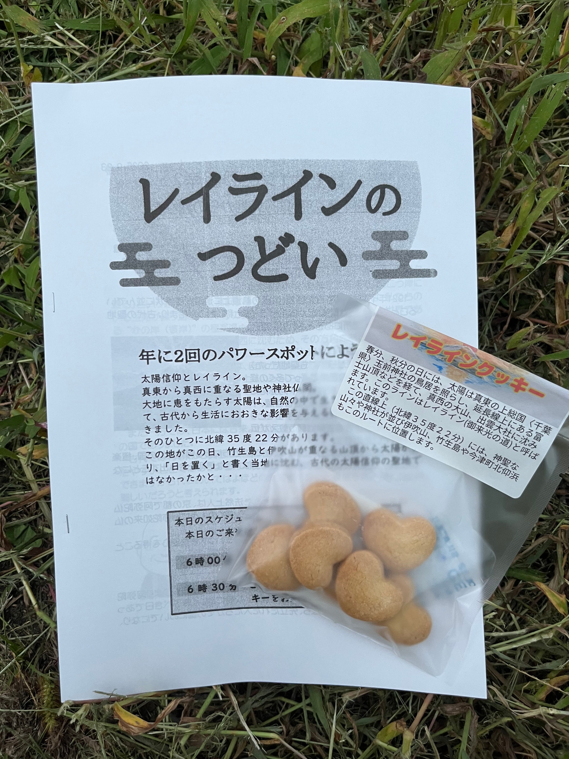 声掛けしてくれた人は地元の今津自治会の人で、どうやら、レイラインを見にきた人に説明ビラとクッキーを配っているとのこと