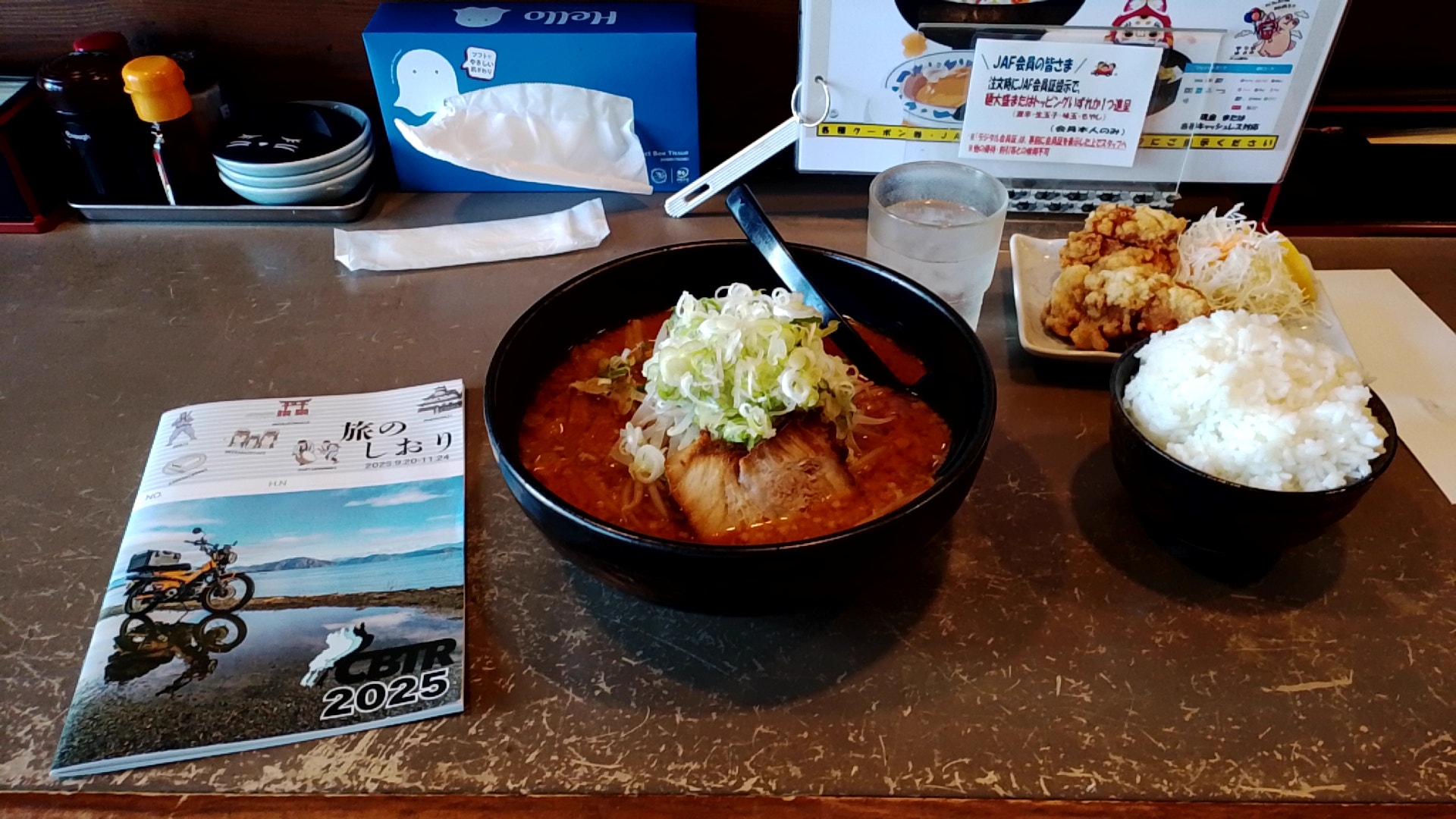 お昼ごはんは岐阜の市内の21号線からちょっと入った所にある二十麺創さんに寄りました。CBTRの協賛店です。親切丁寧でとても分かり易いご説明ありがとうございました。CBTR会員特典の数ある中で麺大盛りにしましたがボリュームが半端なかったです。今回、私は味噌ラーメンの唐揚げ定食にしました。とても美味しゅうございました。他にもメニューが沢山あり、次回はツーリングの時に寄らせて頂きます。